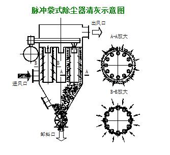 隨著過濾工況的進行,當濾袋表面積塵達到一定量時,由清灰控制裝置(差壓或定時、手動控制)按設定程序打開電磁脈沖閥噴吹,壓縮氣體以極短促的時間順序通過各個脈沖閥經噴吹管上的噴咀誘導數倍于噴射氣量的空氣進入濾袋,形成空氣波,使濾袋由袋口至底部產生急劇的膨脹和沖擊振動,造成很強的清灰作用,抖落濾袋上的